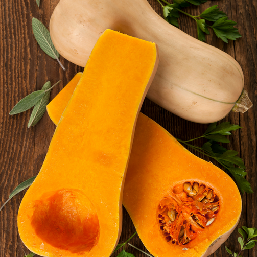 La courge Butternut est une courge musquée qui ressemble à une grosse poire. Elle est à son meilleur lorsqu'elle mesure 20 à 30 cm de long et que sa base a une douzaine de centimètres de diamètre et pèse 4 à 5lb. à maturité. Sa chair moelleuse, au goût léger de noisette, est très orangée. Sa peau lisse se pèle facilement. Si elle est verdâtre, c'est que la courge n'est pas à maturité. Cette courge fait d'excellents potages.